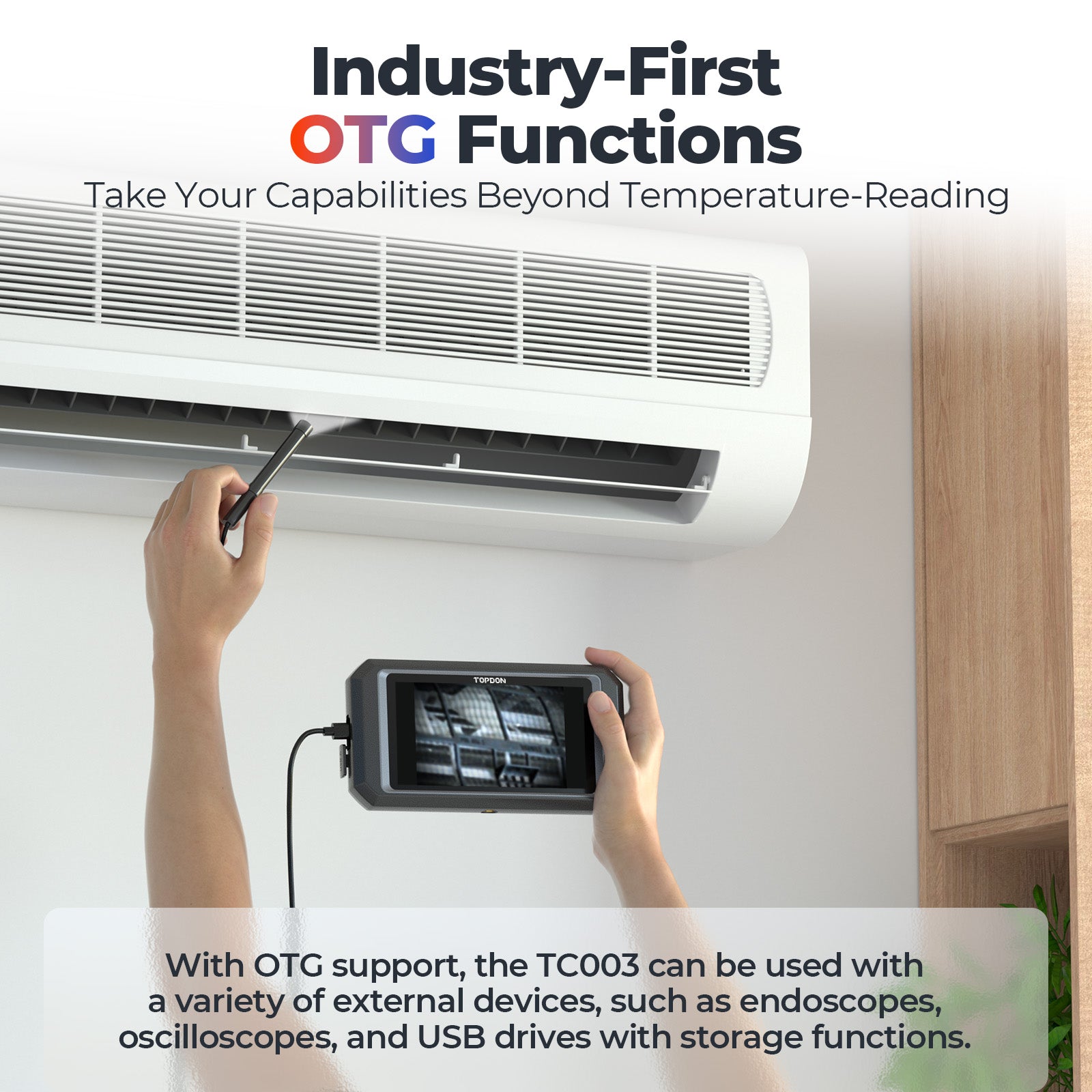 · TC003 er utstyrt med OTG (On-The-Go) funksjonalitet, som lar verktøyet fungere som en vertsdatamaskin, og utvider funksjonene utover temperaturavlesning og inn i ditt daglige liv. Med OTG-støtte kan TC003 brukes med en rekke eksterne enheter, som endoskoper, oscilloskoper og USB-stasjoner med lagringsfunksjoner, noe som muliggjør ytterligere funksjonell utvidelse og løser et bredere spekter av problemer.